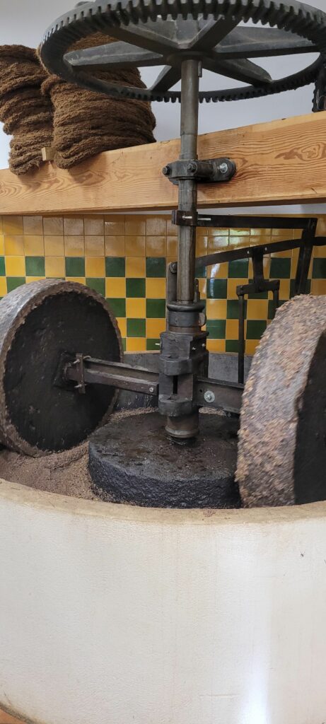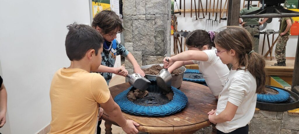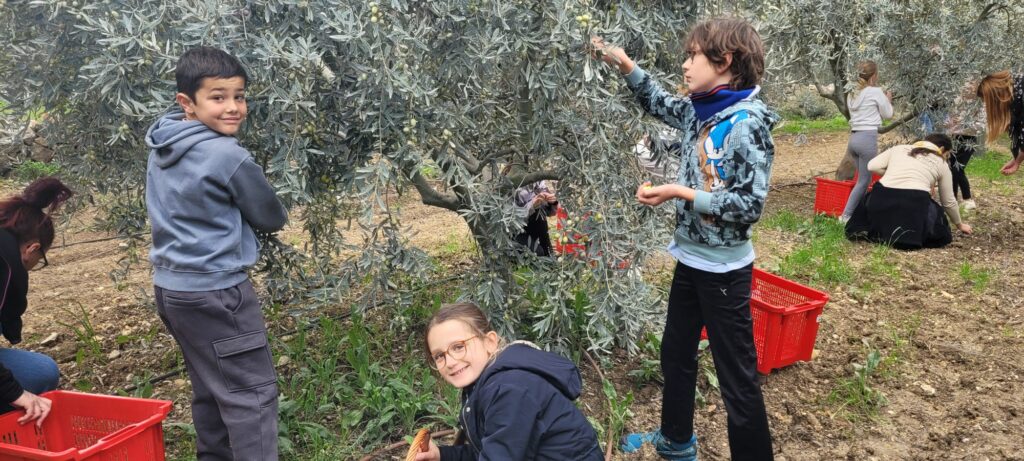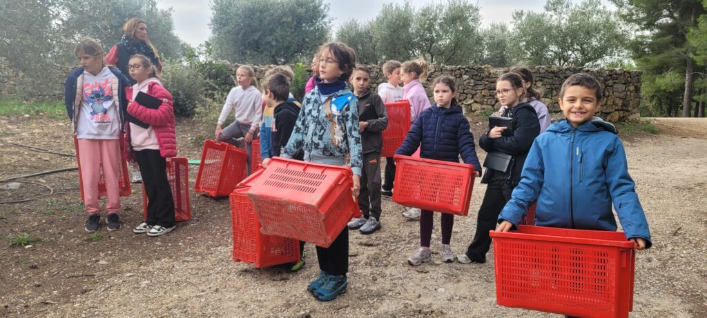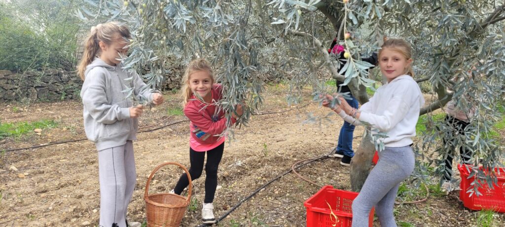 Après avoir récolté les olives, (environ dix kilos par équipe), les élèves ont appris les différentes étapes de la fabrication de l’huile d’olive. Ils ont assisté au broyage des olives (dans la meule) et mis la pâte obtenue dans les scourtins. Les enfants ont également goûté différentes huiles et différentes variétés d’olives. A la fin de la journée, ils ont utilisé le pressoir pour extraire le jus. Toute la classe est repartie avec une bouteille d’huile et son étiquette personnalisée et surtout avec plein de beaux souvenirs dans la tête !