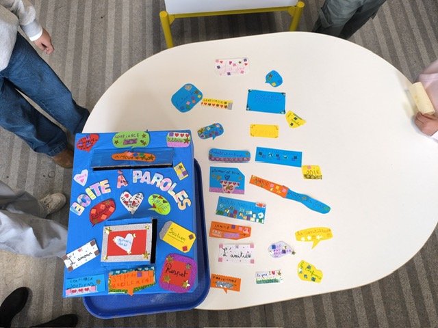 – décoration d’une boîte à paroles. Les enfants pourront y déposer de petits coupons pour parler de leur problèmes. En fonction, il leur sera proposé un temps d’écoute.