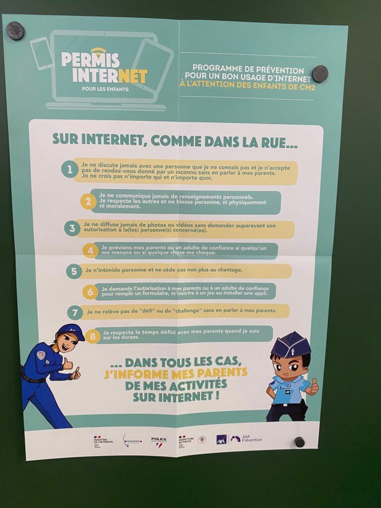Au cours de plusieurs séances, dans le cadre de l’EMC, les élèves de la classe de CM2 ont préparé le permis Internet. Ils en ont vu les règles, les dangers et les mesures de sécurité à suivre afin d’utiliser cet outil dans les meilleurs conditions.